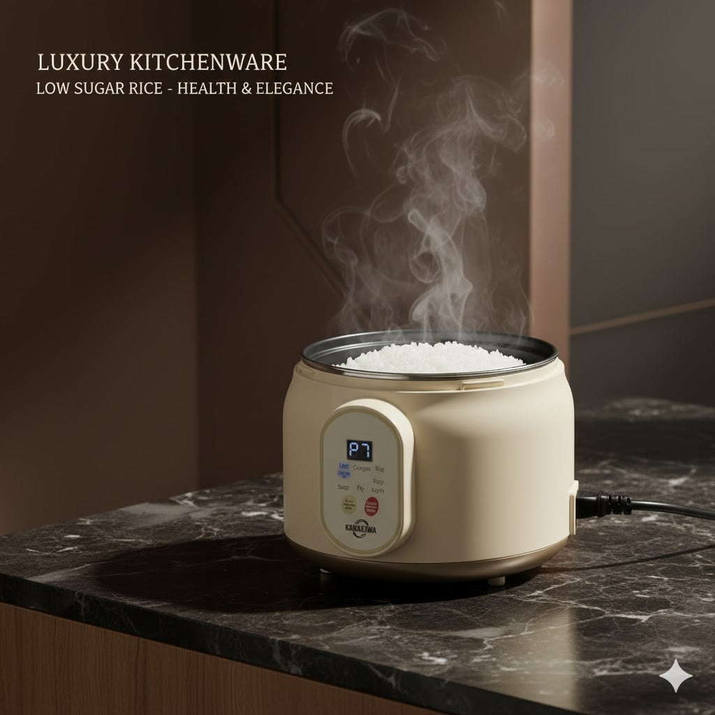A compact and modern appliance designed for healthy, low-sugar cooking. With its digital touchscreen, it offers easy operation and precise control, while the steam rising highlights its efficient performance for perfectly cooked rice every time.